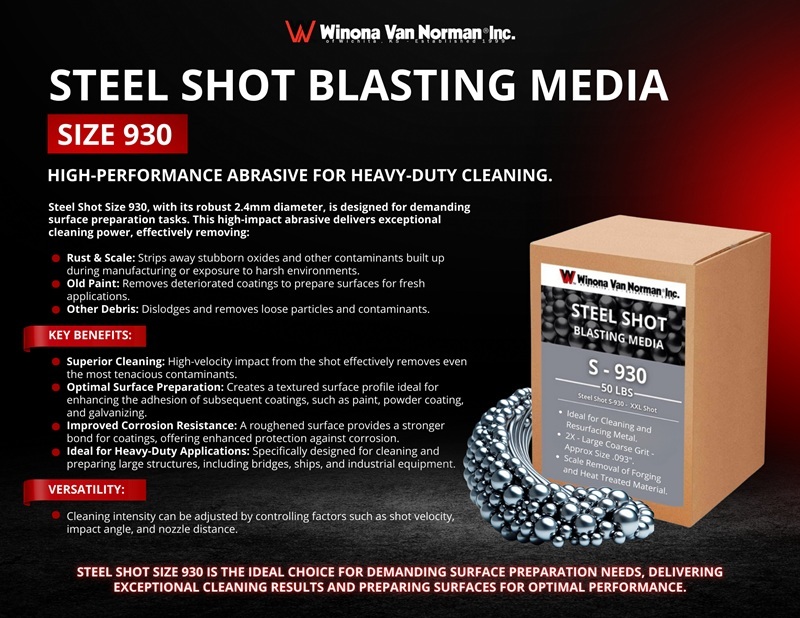 Steel shot is the ideal material for metal resurfacing, cleaning, and stripping. S-930 Shot is a large shot size, approximately .093", used for heavy removal of large-sized castings, scale removal of forging and heat-treated work pieces, surface blast cleaning of steel plates, sections and steel structures, shot peening of workpieces, as well as cutting of granite. Choose the size which creates the desired result. S-230, S-280, and S-330 size shot produce a medium finish with good coverage. S-390 and S-550 are coarser for heavy iron and steel. S-70, S-110, and S-170 are finer to produce a smooth finish with excellent coverage. Winona Van Norman can fulfill all metal cleaning and finishing needs. S-660 and higher are for the heaviest uses.